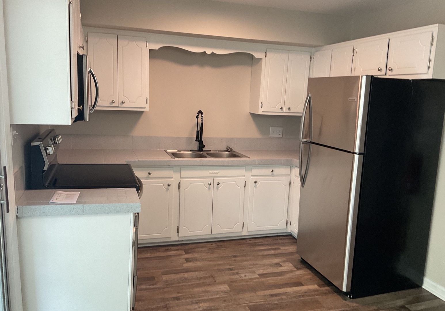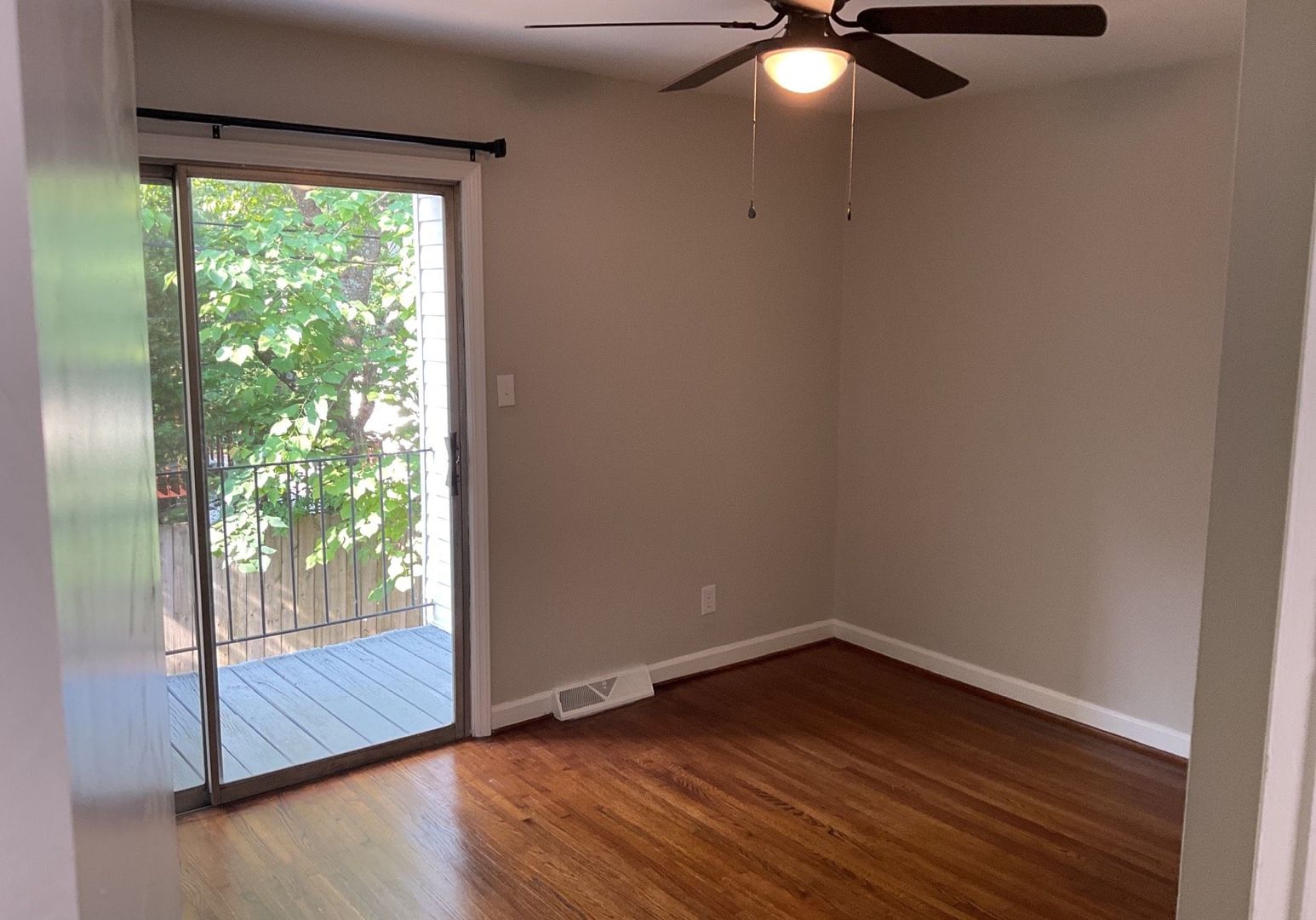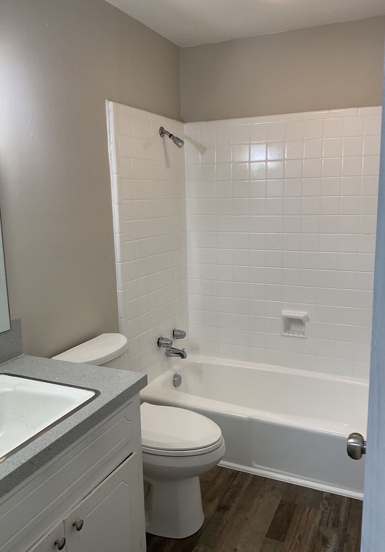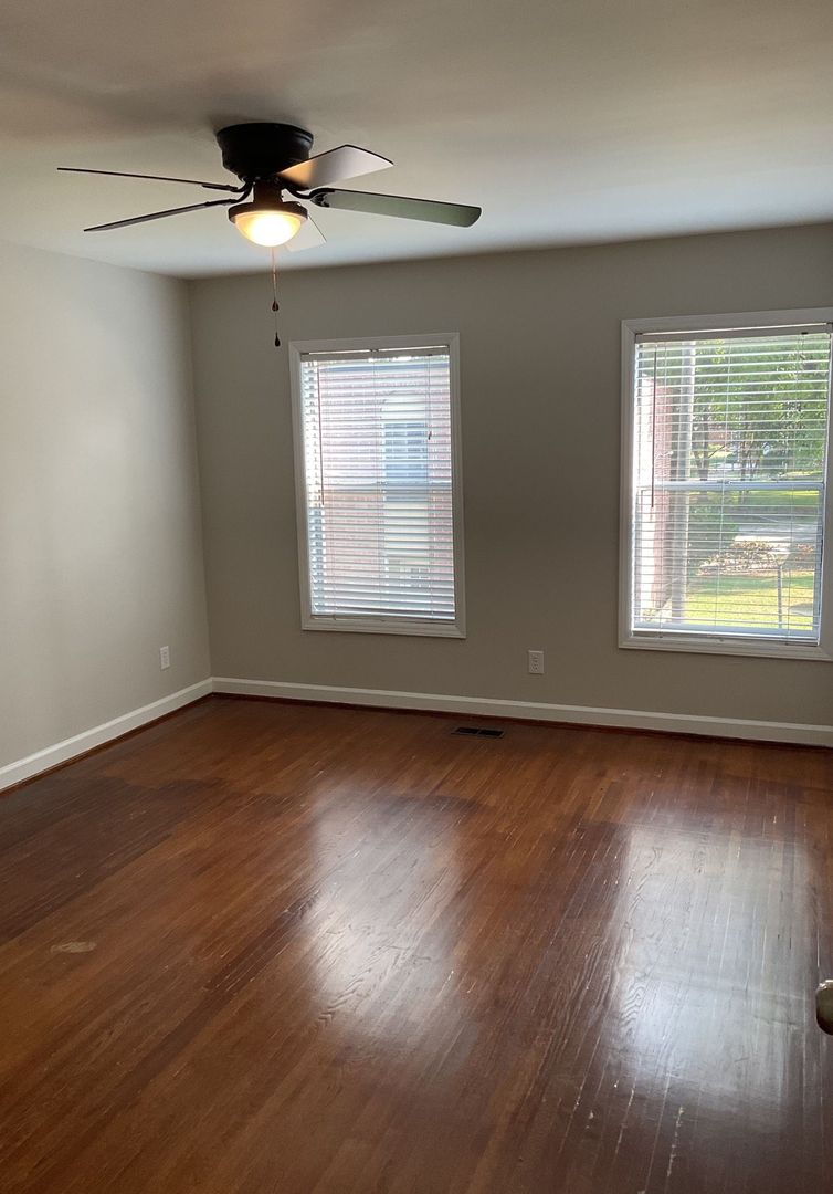 This townhome has hardwood flooring throughout, a large living room, 1.5 baths, and 2 spacious bedrooms. You will love the private patio off the eat-kitchen and private balcony. This home is very spacious and has everything you need! Off street parking. Hardwood flooring throughout - not carpet!!